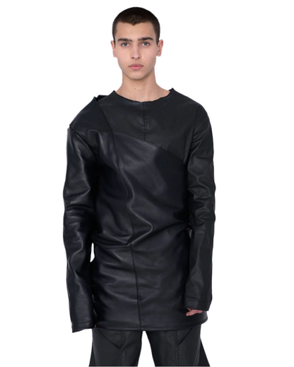 Men goatskin leather top with waxed denim inside blouse.